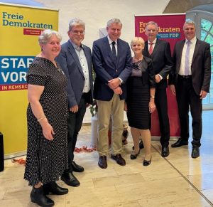 v.l.Marianne Günther, Kai Buschmann, Hans-Ulrich Rülke, Erika Schellmann, FDP-Landtagskandidat Wolfgang Vogt, Oberbürgermeister Dirk Schönberger