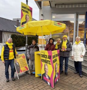 Bei durchaus noch kühlem Wetter waren die Remsecker Freien Demokraten heute, 07.02.2026, früh in Neckarrems in der Dorfstr. vor dem Neckarrems Bäck.