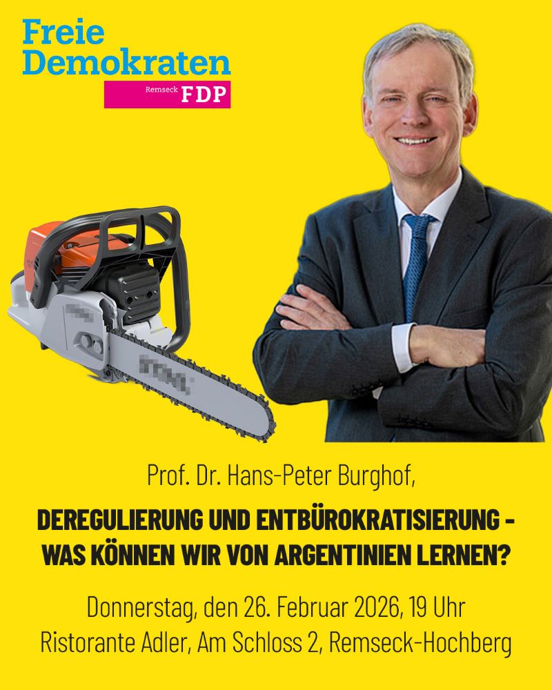 Zu dieser spannenden Veranstaltung lädt die FDP Remseck zusammen mit FDP Landtagskandidat Wolfgang Vogt recht herzlich ein: Donnerstag, den 26. Februar 2026, 19 Uhr Ristorante Adler, Am Schloss 2, Remseck-Hochberg.