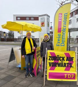 Infostände sind ja immer auch ein Spiegel der politischen Stimmung und Meinung. Wenn 50% der Passanten die FDP meiden, finden wir das zwar nicht gut, nehmen es aber zur Kenntnis. Wenn mehr als 20% der Passanten sich ansprechen lassen, ein Flyer mitnehmen oder direkt auf die FDP zukommen, dann ist das ein tolles Signal. Besonders stolz erzählte uns ein Standbesucher mit ausländischen Wurzeln, dass seine Tochter die Staatsprüfung geschafft habe und als Lehrerin für Physik und Wirtschaftskunde arbeite. Er habe ihr empfohlen, der FDP beizutreten. Das finden wir klasse.