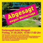 Wegen der Wetterlage mit angesagtem Dauerregen sagen wir das Minigolf-Spielen für heute ab. Danke für das Verständnis Eure FDP Kandidatinnen und Kandidaten der Wahlliste 4 – FDP!