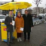 FDP Infostand in Pattonville Bei leichten Temperaturen über dem Gefrierpunkt und feuchter Luft waren v.l. Gustav Bohnert, Erika Schellmann und Kai Buschmann in Pattonville zum Infostand: „Nicht nur vor der Wahl“. Im Gepäck Mandarinen, Bleistifte, Windrädchen, Luftballons.
