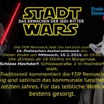 Unter dem Oberbegriff „Stadt Wars“ und dem Untertitel „Das Erwachen der Jedi Ritter“ werden die Freien Demokraten Remsecks wieder die kommunale Szene des letzten Jahres durchleuchten und kabarettistisch Highlights im publikumseinbindenden Rollenspiel vortragen. Bitte vormerken: 10.02.
